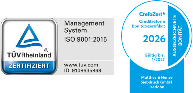 Zwei unabhängige Organisationen bestätigen unseren kompromisslosen Qualitätsanspruch: Der TÜV Rheinland verlieh uns die international anerkannte Zertifizierung DIN EN ISO 9001:2015 für außerordentliches Qualitätsmanagement. Die Auskunftei Creditreform bescheinigte uns mit dem CrefoZert vorbildliches Geschäftsgebaren. Nur 1,7 Prozent aller deutschen Unternehmen dürfen diese Auszeichnung tragen.
